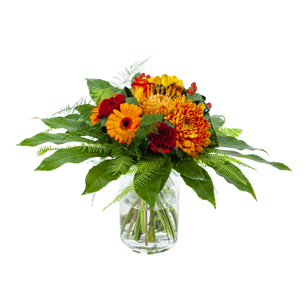 De combinatie van oranje en rode bloemen geven het bladboeket een gezellige en chique uitstaling. Een boeket dat in vrijwel elk interieur past. Bovendien geschikt voor verschillende gelegenheden. Feliciteer, bedankt of verstuur zomaar dit prachtige handgebonden boeket en verras de ontvanger! * Exclusief accessoires en vaas
